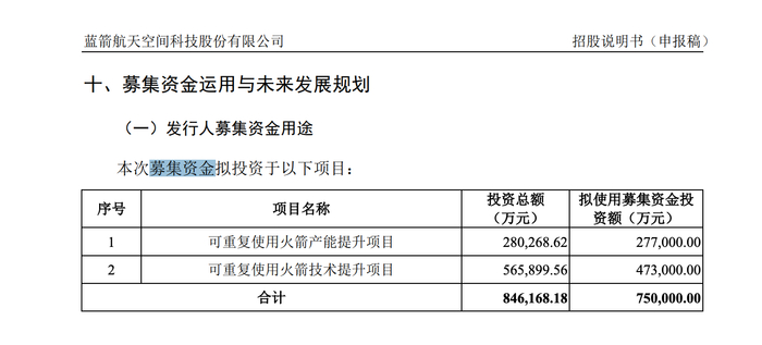 招股书申报稿显示,蓝箭航天IPO拟募资75亿元。蓝箭航天表示,通过本次上市募集资金,大力提升公司可重复使用火箭技术研发、提高发动机与火箭批量化制造能力,充分发挥自身在火箭设计、研发、试验、生产总装、发射的全链条交付能力,实现低成本、大运力、可重复使用火箭的商业化运营,积极响应国家战略规划与迫切的发射服务市场需求。