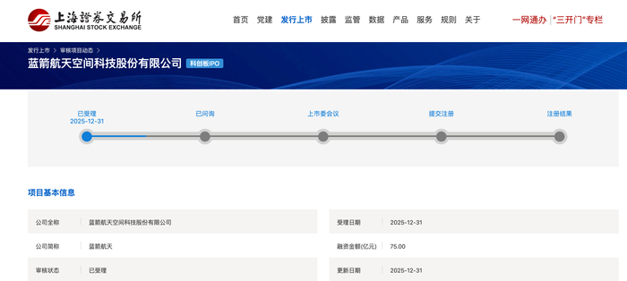 本报讯 (记者毛艺融)2025年12月31日,上交所官网信息显示,蓝箭航天空间科技股份有限公司(简称“蓝箭航天”)科创板IPO申请获受理,正式冲刺科创板“商业火箭第一股”。