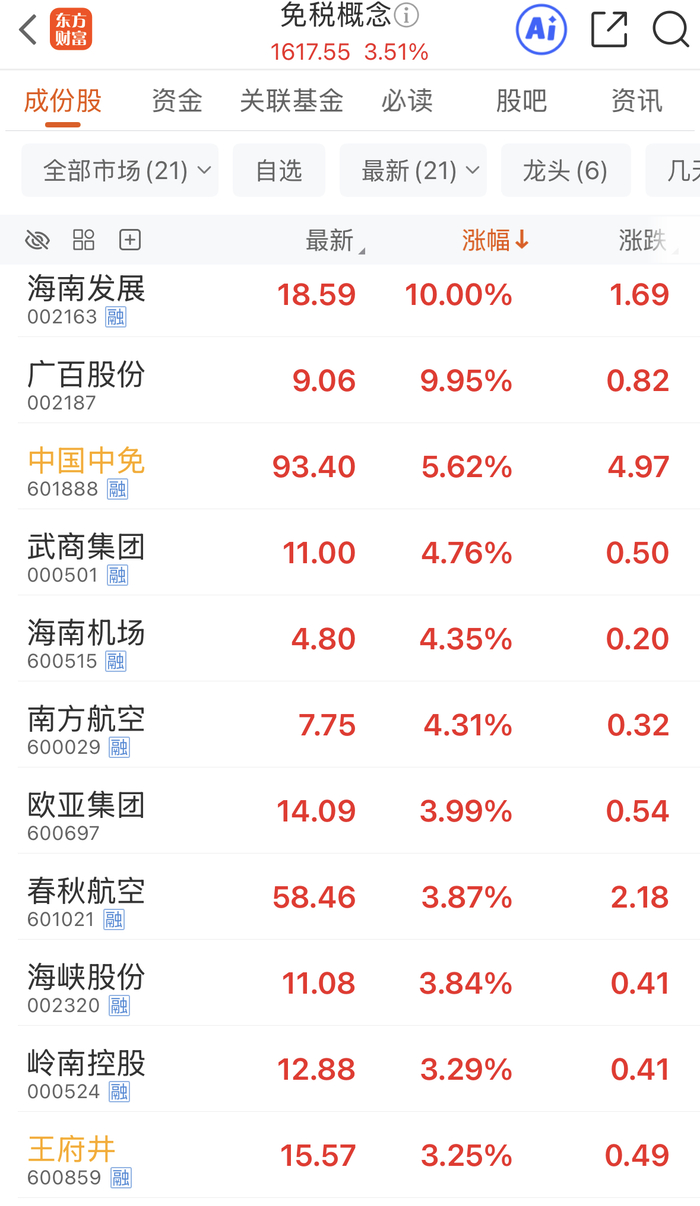 东方财富数据显示,截至收盘,大消费板块个股中,大连圣亚、九华旅游封板涨停,君亭酒店、三峡旅游、首旅酒店、锦江酒店等多股跟涨。免税概念方向,海南发展、广百股份强势封板涨停,龙头股中国中免涨5.62%,海峡股份、海南机场、凯撒旅业、王府井等多股跟涨;航司方面,如中国东航涨6.06%、中国国航涨4.14%、南方航空涨4.31%。