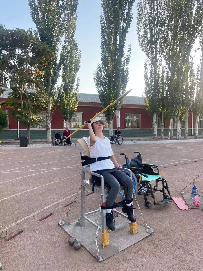 杜丹妮练习铅球、铁饼、标枪“铁三项”,因为手指没有握力,她先从扔瓶子练起,小矿泉水瓶装满水,手掌托住,丢出去,“凭感觉找角度,最开始不砸到自己就很好了。”为了增强臂力,她在手臂上绑沙袋,从0.5千克增到2千克,慢慢试着举过头顶。丢了两个月的水瓶,换成铅球接着丢,手上磨出了老茧。