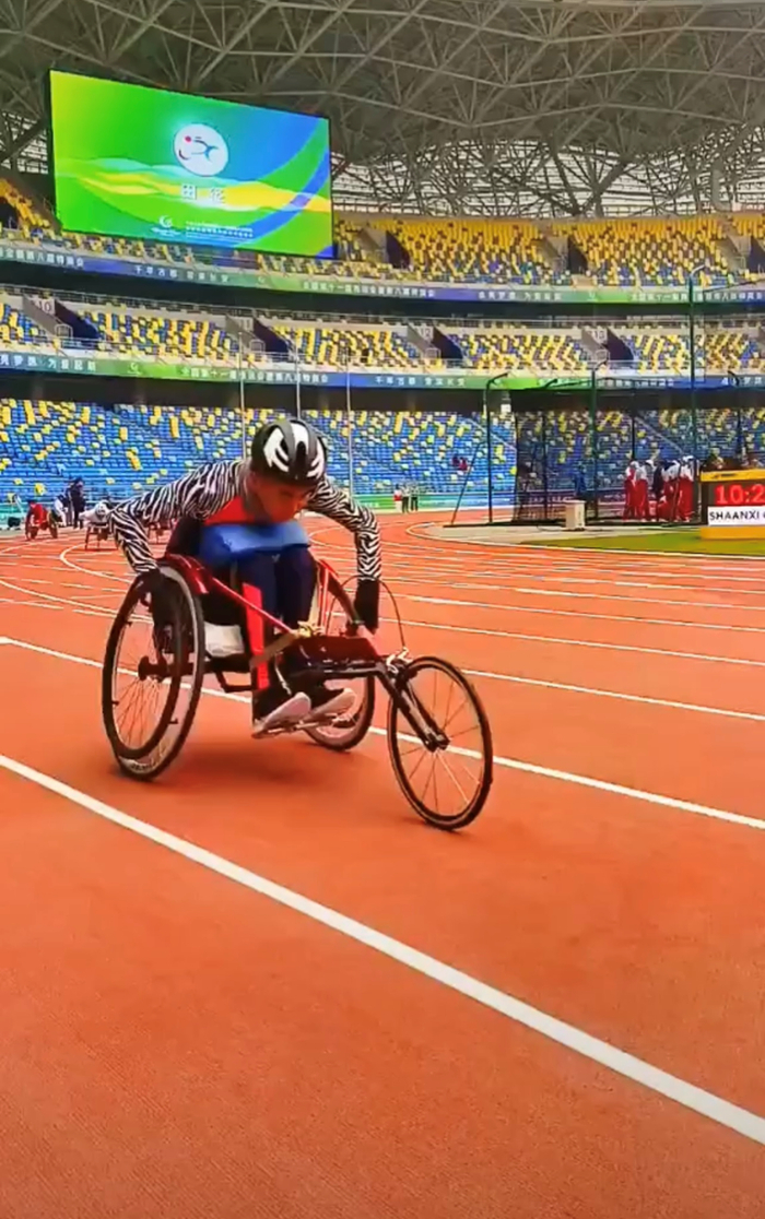 贾建东在全国第十一届残运会上获得了男子轮椅竞速T51级比赛银牌,200米一圈用时5分56秒。T51级是运动员伤残程度最重的,赛道上只有3名运动员,说是“竞速”,但现场看上去并不激烈,甚至很缓慢。观众或许没发现,贾建东划到一半时左胳膊已经快抬不起来。“我很紧张,心里只有一个念头,绝对不能停下来。”最后他右胳膊划两下、左胳膊划一下完成了比赛。