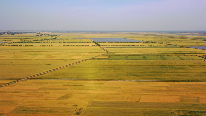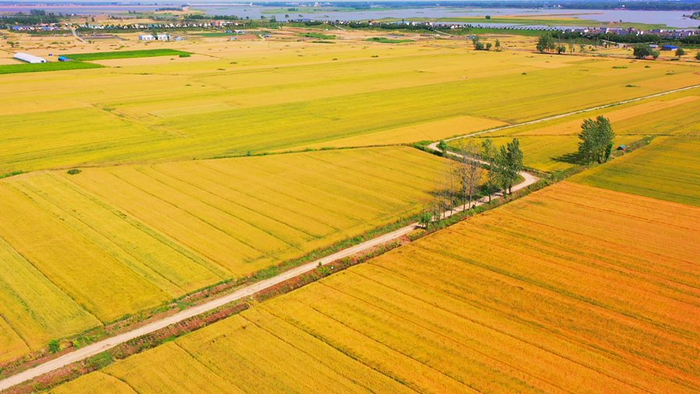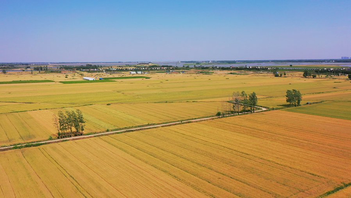 初夏时节,安徽省颍上县广袤大地上麦香四溢。麦田在阳光下泛着金黄,麦浪滚滚,收获在望。麦田、村落、河流、阡陌构成一幅美丽的田园风光。