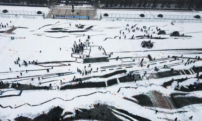 12月28日在哈尔滨工程大学拍摄的“福建舰”航母雪地图案(无人机照片)。新华社发(刘洋摄)新华社哈尔滨12月28日电(记者杨思琪)230米长、112米宽的操场上,一艘威武的“福建舰”航母破雪而行,伴随其侧的是三架舰载机……28日,位于黑龙江的哈尔滨工程大学校园内,1200余名师生集体在雪地上“绘制”航母福建舰。