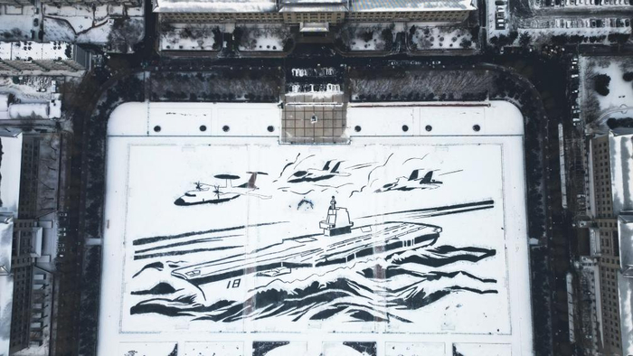上午10时,在零下十几摄氏度的低温中,师生们以铁锹为笔,通过北斗卫星定位等专业技术“施工”。对照图纸清理积雪、修整轮廓……一个半小时后,线条硬朗、细节精准的航母图案在银装素裹的操场上清晰呈现。