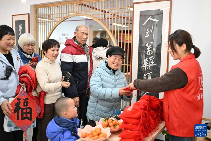 1月22日,居民在江苏省昆山市昆苑社区新时代文明实践站领取新年福袋。春节临近,年味渐浓。各地举办年货大集、写福字春联等活动,人们选购鲜花、中国结等饰物,迎接新春。
