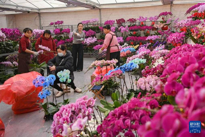 1月22日,市民在山东省青州市花卉苗木交易中心选购鲜花。春节临近,年味渐浓。各地举办年货大集、写福字春联等活动,人们选购鲜花、中国结等饰物,迎接新春。