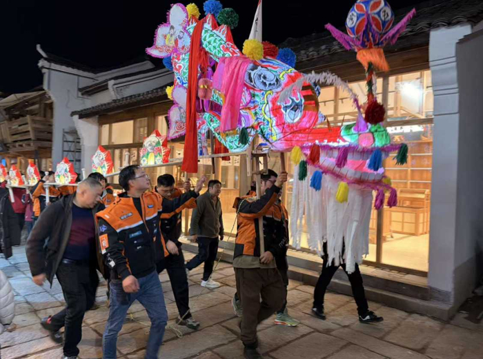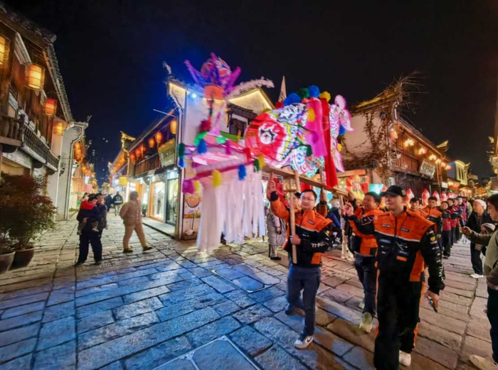 在非遗传承人的带领下,骑手小哥化身“舞龙手”,抬起板凳龙沿街巡游。昂首的龙头、熠熠生辉的龙身在夜色中蜿蜒起伏,宛如巨龙舞动。沿街居民驻足喝彩,祈福声、欢笑声、锣鼓声交织,东街年味浓浓。“第一次体验舞板凳龙,太震撼了!这不仅是一项非遗文化,更让我感受到了传统文化的魅力和团结的力量。” 参与舞龙的小哥激动地表示。