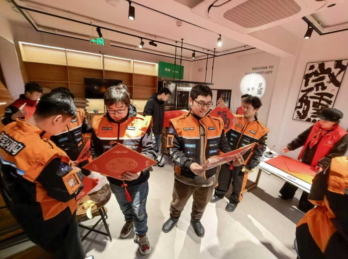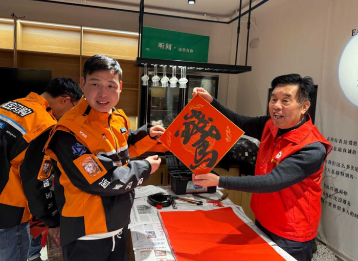 墨香送福,春联寄情。帮忙老哥志愿者团队的两位书法老师现场挥毫,一幅幅寓意吉祥的春联、一个个饱含温情的 “福” 字跃然纸上,既有新春祝福,也有对骑手小哥扎根浦江的期许。大家边驻足观赏,边挑选心仪的春联,脸上满是笑意。“手写春联年味浓,贴在家里肯定喜庆!”一位骑手捧着春联喜笑颜开。