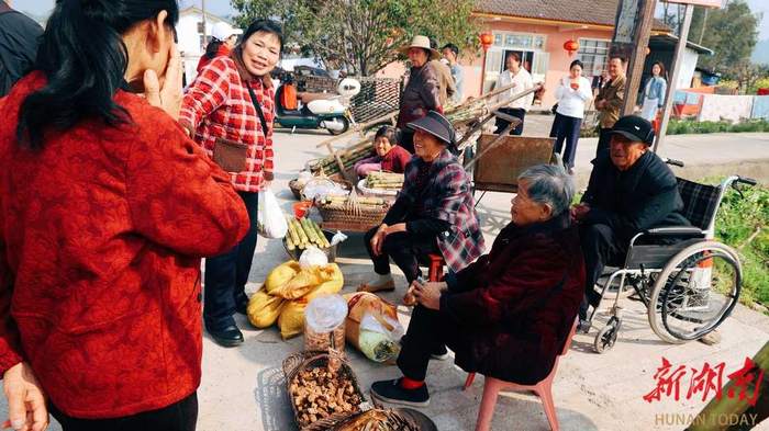 村民清晨采摘的青菜、香椿、蕨菜,手工腌菜、酸豆角、腊肉,自酿米酒、菜籽油,还有蒿子粑粑、紫薯饼、米豆腐等本地小吃,摆放在茅草摊位上,引来游客打卡、品尝、购买。刘蓉 摄