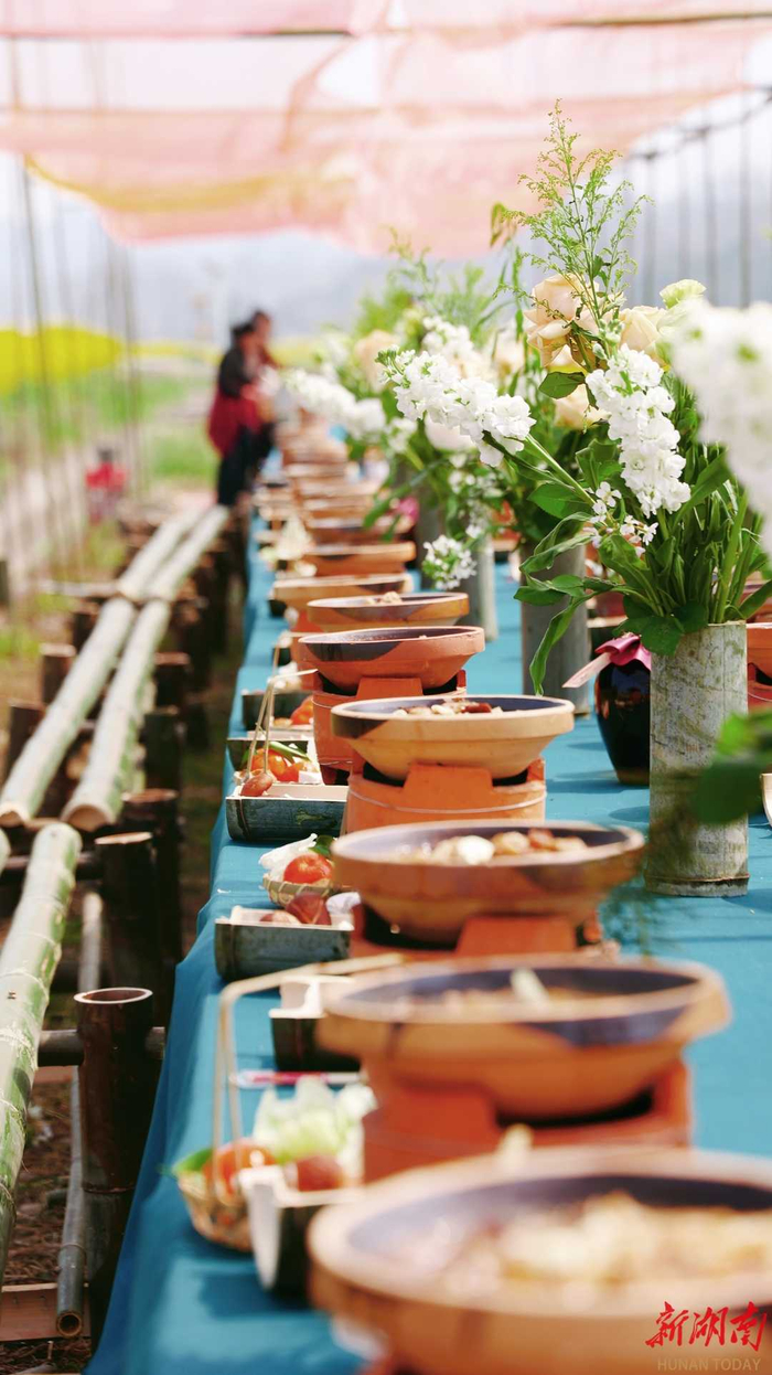 花田春宴上,村民设酒炖钵,“咕嘟咕嘟”——钵子菜的热辣滚烫,伴着清脆的鸟叫,这是村民用最原生态的风味佐以花田间满满的氛围感,招待远道而来的贵宾。