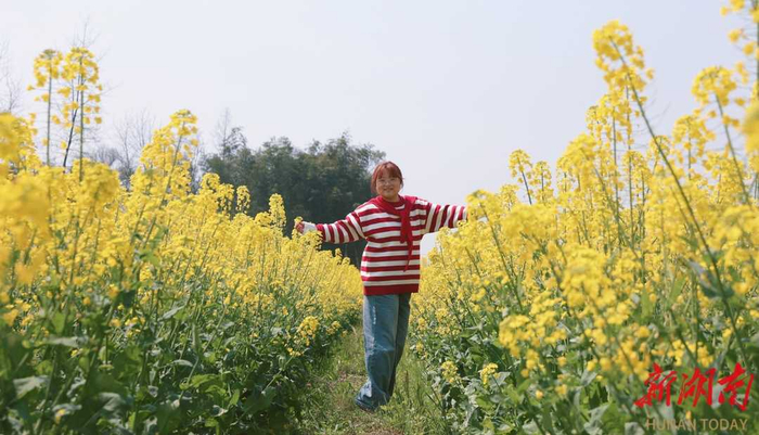 花田里,齐人高的油菜在阳光的照耀下格外灿烂,游客俏皮留影,清新活泼的姿态与金黄花海相映成趣,充满春日活力。刘蓉 摄