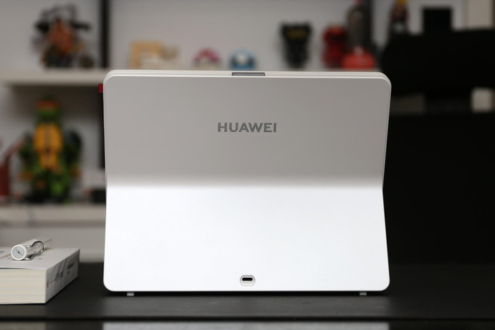 在小精灵学习智慧屏的背面没有做太多设计,一个简单的“HUAWEI”logo,其电池容量为42Wh(11.36v/3665mAh),搭配一台22.5W的快充充电套装,Type-C充电接口设计在背面底部中间位置,应该是为边充边用设计的;而小精灵智慧屏的这个仰角也是经过精心计算的112.5°仰角科学坐姿角度。