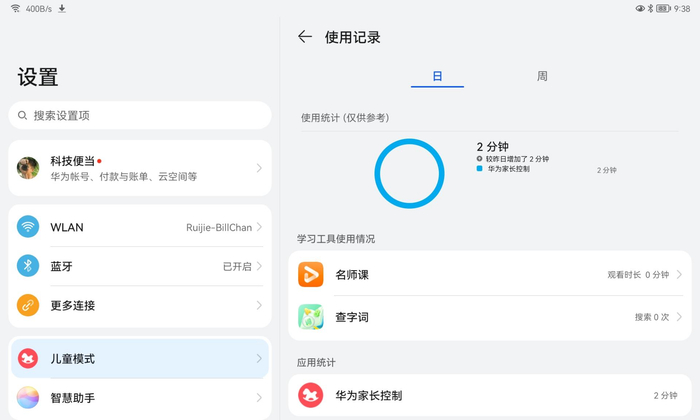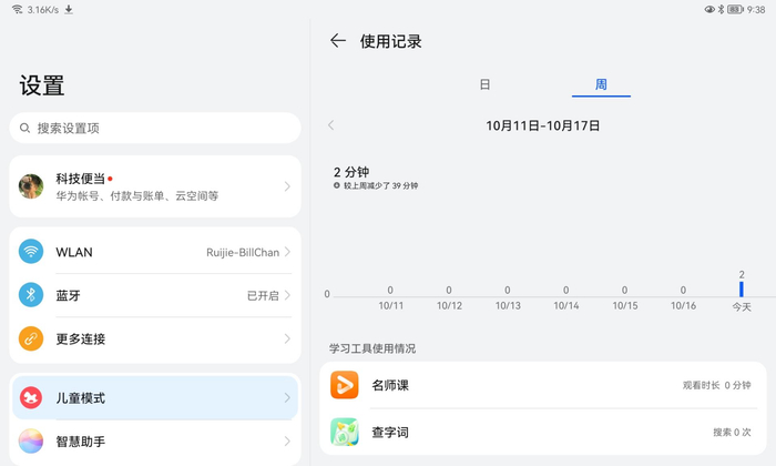 然后在设置中的儿童模式选项里,还可以对孩子学习情况进行直观的查看,有没有学习,学习效果怎么样,一目了然。家长还可以在华为手机或者华为平板(产品需搭载HarmonyOS 2.0系统)等端设备上对题目进行实时批注,边讲边画,更容易让孩子理解。