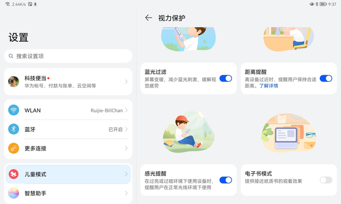 ,在华为小精灵学习智慧屏的HarmonyOS 2系统下,为用户提供多个维度护眼保护:打开滤蓝光模式、距离提醒(感应到儿童距离屏幕过近会自动发出提醒)、感光提醒(环境光过强或过暗均会提示,保证用眼卫生),用户还可以开启电子书模式(在阅读文本类内容时可以模仿纸质书的视觉效果)。加上本身莱茵低蓝光、无频闪认证硬件级护眼,合理计划好时间有规划的学习是不需要过分担心的。