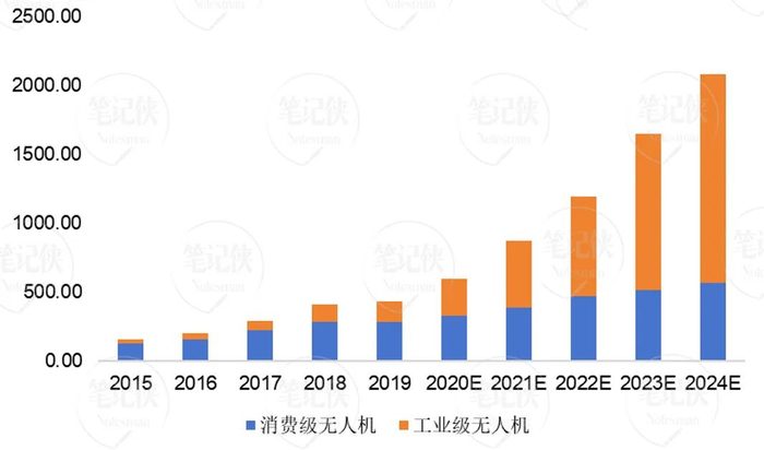 2015年至2019年,消费级无人机在民用无人机市场占有较大市场份额,而根据弗若斯特沙利文的测算,自2020年起,随着工业无人机应用场景的拓展,全球工业无人机市场规模已然超过消费级无人机。