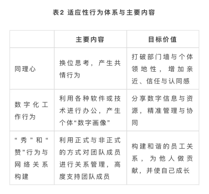 我们发现,为了更好地组织协同,个体的适应性行为的关键之一就是顺应数字化的要求,高效率地展开数字化工作行为。