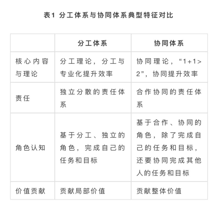 基于分工理论,原来的分工体系通过专业化和等级制度极大提升了组织效率。现在的协同体系则基于协同理论通过合作和协同产生“1+1>2”的效果,以此提升组织整体效率。从价值贡献来看,分工贡献的是局部价值,而协同贡献的是整体价值(参见表1)。