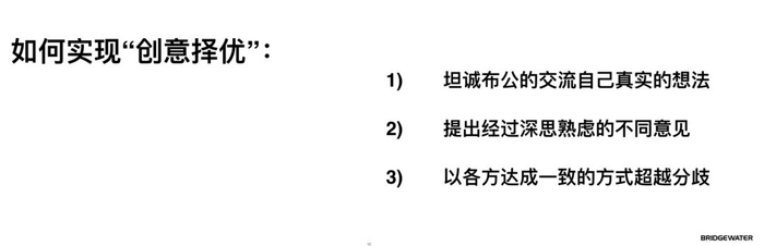 通常情况下人们不会这么做,大家不愿意把自己的想法,一开始就放到桌面上。但要实现“创意择优”,首先就要把真实的想法提出来。