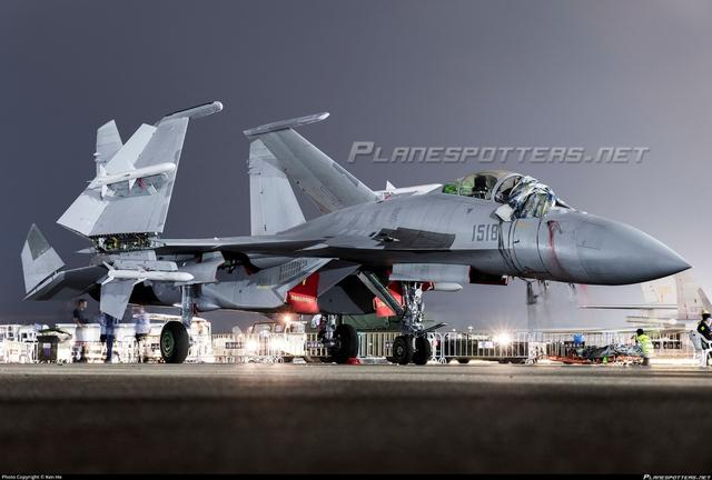 图片:歼-15T换装了高性能有源相控阵雷达。弹射起飞让歼-15T能够搭载更多的载荷在航母上起飞。