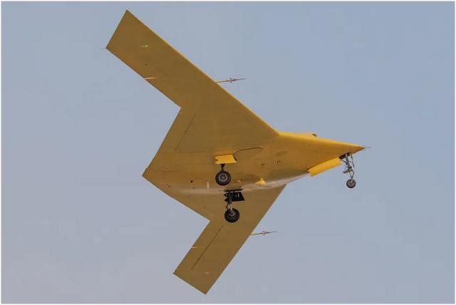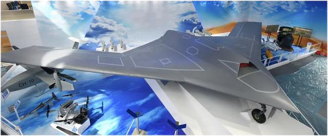 图片:珠海航展上亮相的彩虹-7无人机。性能上:双后掠飞翼布局,UCAV气动结构最优选