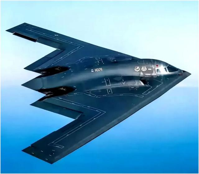 图片:采用前缘单后掠飞翼气动布局的B-2隐身轰炸机。这种单后掠构型采用较为严格的边缘平行原则,厚度较薄的机翼对于机身有显著的屏蔽作用,侧向和前向隐身性能较好。