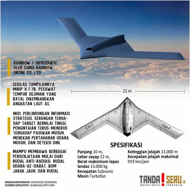 目前,众多国内外用户对于彩虹-7无人机表现出了巨大兴趣。西方曾对其进行详细分析,西方媒体曾估计彩虹-7无人机巡航高度10000~13000米,采用涡轮风扇发动机,巡航速度0.5~0.6马赫,最大平飞速度达到0.75马赫,续航时间15小时,作战半径2000千米,全机上下涂有吸波涂料,雷达散射面积能够达到0.01平方米的级别。