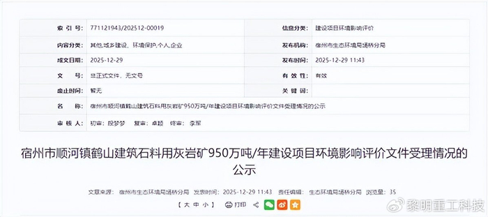 12月29日,安徽省宿州市埇桥区人民政府发布宿州市顺河镇鹤山建筑石料用灰岩矿950万吨/年建设项目环境影响评价文件受理情况公示。