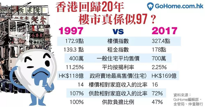 如果将1997年7月的楼价、CPI及平均薪酬与2011年数据对比,结论更有意思。2011年的CPI刚刚接近1997年的水平(即14年中经济基本并无寸进),2011年的整体楼价较1997年顶峰低约6%,但薪酬则较1997年增长约10%。由于楼价升幅主要由豪宅带动,所以普罗大众的置业负担其实比1997年时候要轻。
