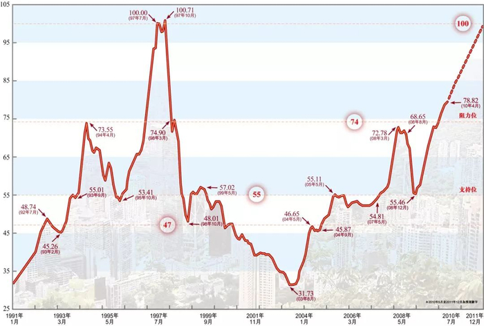 尽管2011年的楼价看起来已经很高,但还没有突破1997年的峰顶。根据中原城市领先指数,香港楼价于1997年6月29日创出历史新高;截至2011年7月1日,只有港岛的楼价超越历史高位,九龙较当年低4%,新界东低6%,新界西低22%。而港岛价格主要由豪宅带动,后者已持续上升多年,早已超越1997年水平;但大众住宅在2009、2010年才接近1997年的水平。