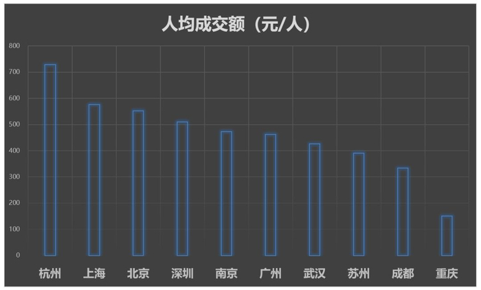 上海、北京的双11总成交额遥遥领先,到了百亿俱乐部,但人均成交额却低于杭州,深圳2017年人均GDP全国第一,但双11人均成交额仅排第4。