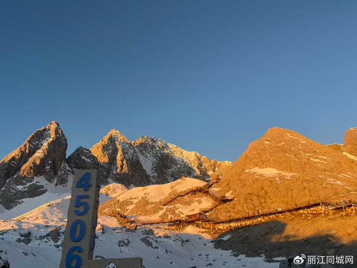 光的蔓延极快,从主峰的尖端开始,金色的光晕顺着山体缓缓流淌,原本银装素裹的峰峦,顷刻间被镀上了一层温暖的金辉。“日照金山”的盛景在此刻铺展开来,群峰仿佛被唤醒的玉龙,周身流转着神圣的光泽,山间的雾霭被光穿透,化作流动的金纱,在山谷间穿梭缭绕。此刻的玉龙雪山,不再是单纯的自然景观,更像是天地间的精灵,在新年的第一缕光中舒展着沉睡已久的身躯。