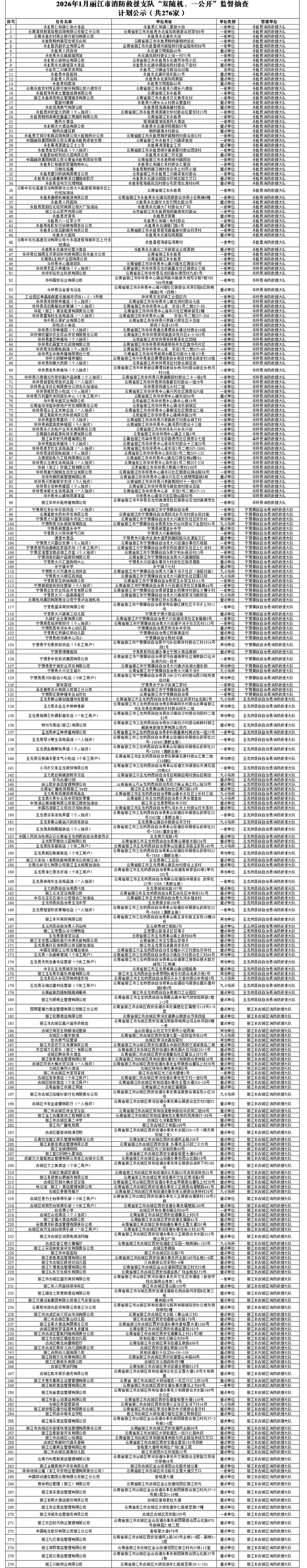 2026年1月,丽江市消防救援支队计划对276家单位开展“双随机、一公开”消防监督抽查,涉及范围包括永胜县、华坪县、宁蒗彝族自治县、玉龙纳西族自治县、古城区等全市各区县,涵盖酒店、商超、餐饮、企业、九小场所等多类经营主体。