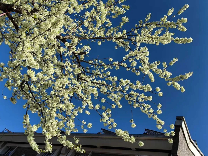 除了温柔的粉,城区里还藏着几树“春日的雪”:白色的冬樱裹满枝桠,像把碎云揉进了枝头,风过时花瓣轻晃,连空气里都飘着清甜的气息。最生动的是那树缀着红灯笼的白樱,传统的红与春日的白撞在一起,是独属于丽江的、暖融融的烟火气。