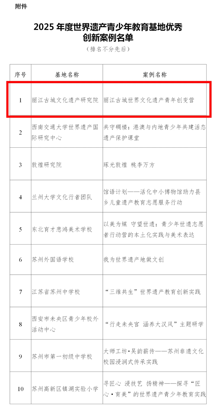 近日,联合国教科文组织亚太地区世界遗产培训与研究中心(苏州分中心)公布2025年度世界遗产青少年教育基地创新案例评选结果,“丽江古城世界文化遗产青年创变营”成功入选,成为兼具创新性、实效性、可复制性与国际视野的示范项目之一。