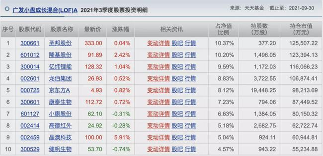 截止2021-09-30广发小盘成长混合(162703)相比于二季度重仓股的变化来看,三季度新进晶澳科技,调出恒力石化。减仓圣邦股份、隆基股份、亿纬锂能,加仓龙佰集团,京东方A、康泰生物、小康股份、高德红外、健帆生物仓位与二季度仓位保持不变。