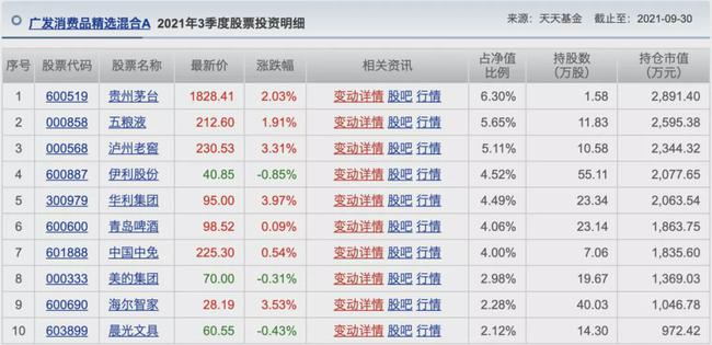 截止2021-09-30广发消费品精选混合(270041)相比于二季度重仓股的变化来看,三季度新进美的集团、海尔智家,调出分众传媒、重庆啤酒。减仓贵州茅台、泸州老窖、伊利股份、中国中免、晨光文具。五粮液、华利集团、青岛啤酒与二季度仓位保持不变。