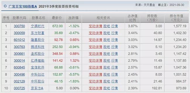 截止2021年9月30日,广发百发100指数基金规模达1.34亿元。具体到个股而言,相较于二季度,3季度降低了中科创达,将锦浪科技、圣邦股份、宝信软件、中环股份调入,将五粮液、贵州茅台、卓胜微、TCL科技调出,对宁德时代、东方财富、隆基股份、亿纬锂能、京东方A的持股数量不变。