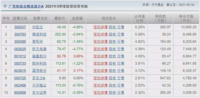 截止2021年9月30日,广发制造业精选混合基金规模达14.63亿元。具体到个股而言,相较于二季度,3季度增持了欣旺达、菲利华、航天电器、隆基股份、国茂股份、京东方A,降低了锦浪科技,将振华科技、天齐锂业、东方证券调入,将立讯精密、海康威视、三环集团调出。