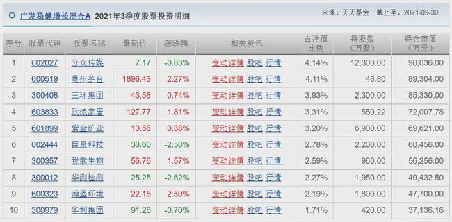 截止2021年9月30日,广发稳健增长混合基金规模达213.42亿元。具体到个股而言,相较于二季度,3季度增持了分众传媒、欧派家居、巨星科技、华测检测,降低了三环集团、紫金矿业,将贵州茅台、瀚蓝环境、华利集团调入,将双汇发展、迈瑞医疗、重庆啤酒调出,对我武生物的持股数量不变。