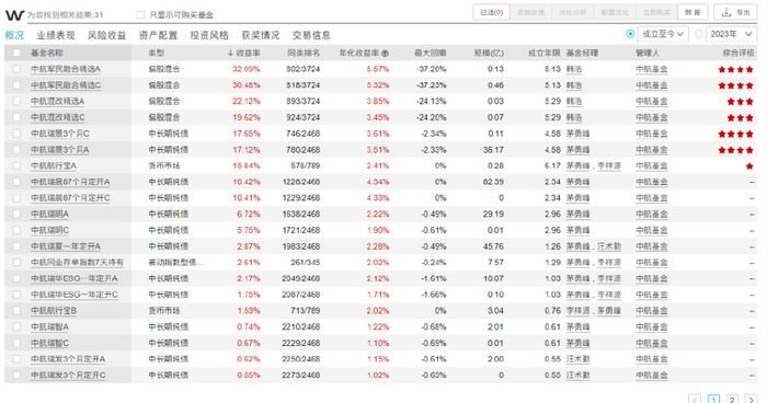 据wind数据显示,中航基金目前各类份额合计有31只产品,收益最高的产品为中航军民融合,属于偏股混合型基金,成立5年时间累计收益32.09%,年化收益率5.57%。