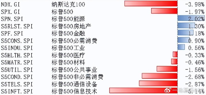 上周(7月15日-19日),纳斯达克100指数整周下跌3.98%,标普500指数整周下跌1.97%,其覆盖的11个行业板块有5个上涨,其中能源领涨2.02%,信息技术领跌5.14%。