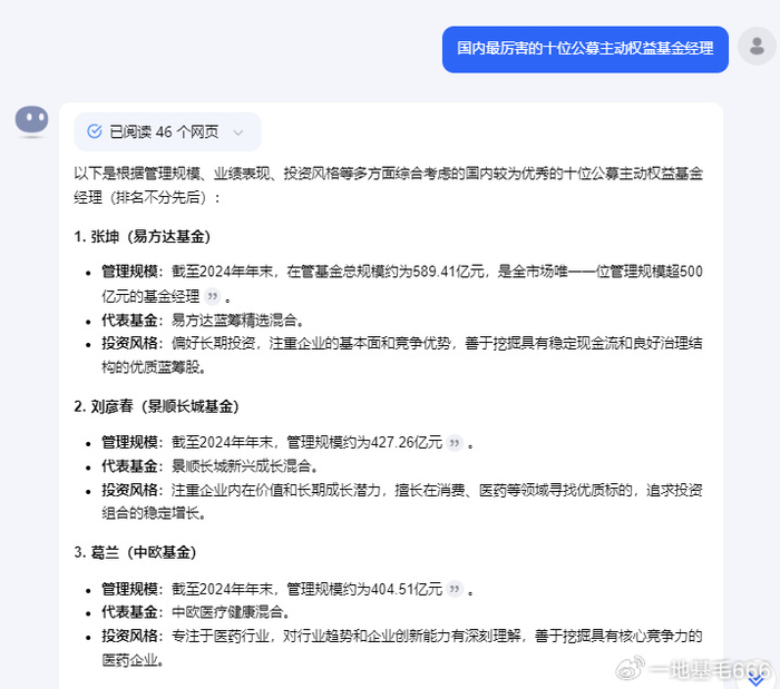 昨天转载了今晚吃基老师的文章《DeepSeek,最好的公募基金经理有哪些?》,有粉丝留言可以将一些深度思考和联网搜索加上,笔者试了下结果确实得到了一些优化。