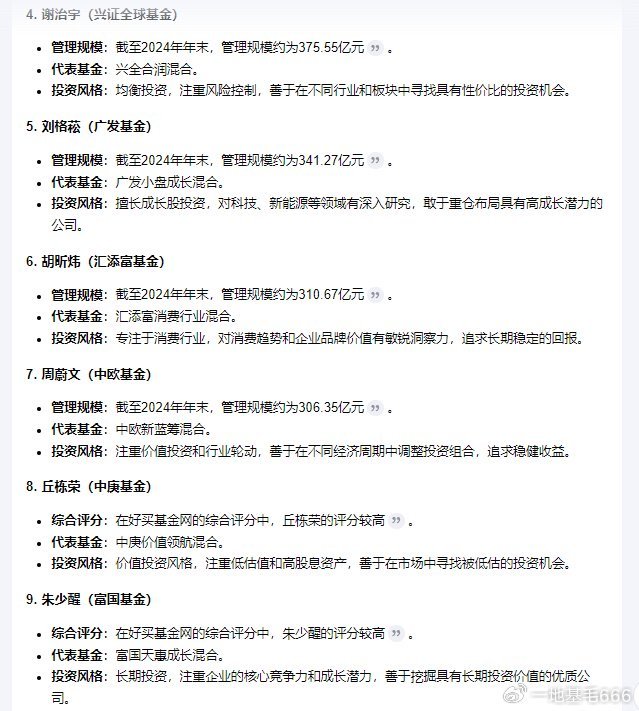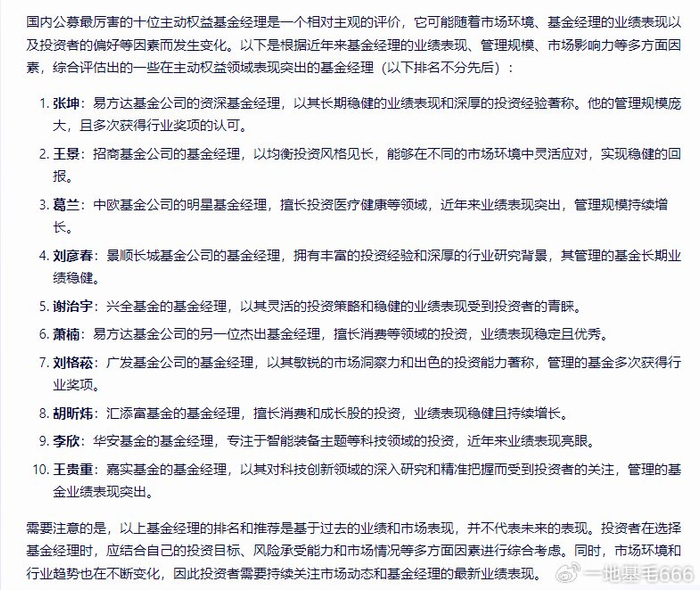 DeepSeek给出的数据是截至2024年,市场上较具代表性的十位基金经理(排名不分先后,仅供参考)