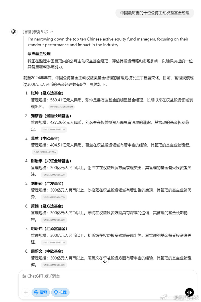 但是!请注意!笔者让它给出十位公募主动权益基金,但是,它只给出八位。