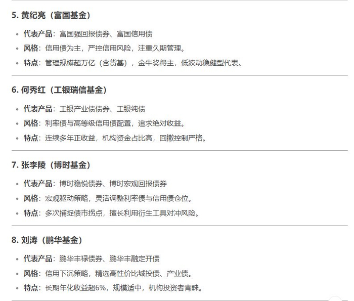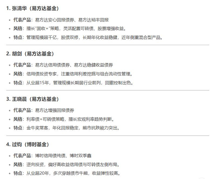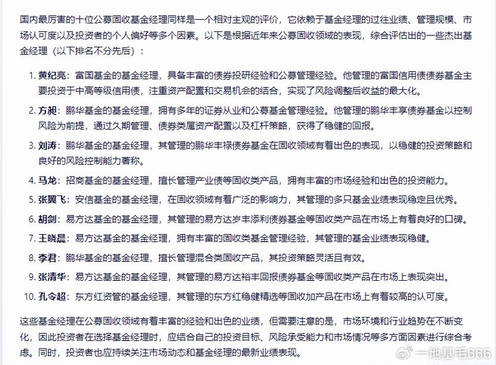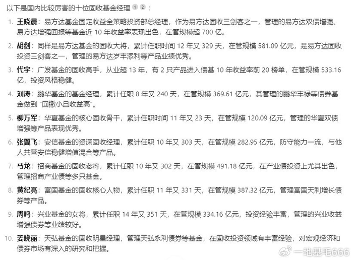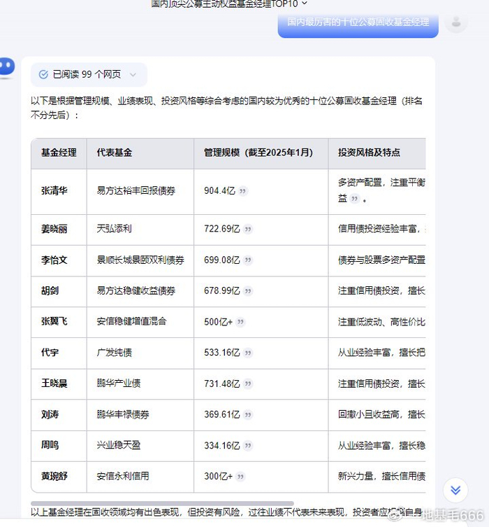 另外笔者还发现,如果对基金经理不加任何限定,AI给出的答案多是主动权益基金经理,所以笔者又增加了固收基金经理的维度。