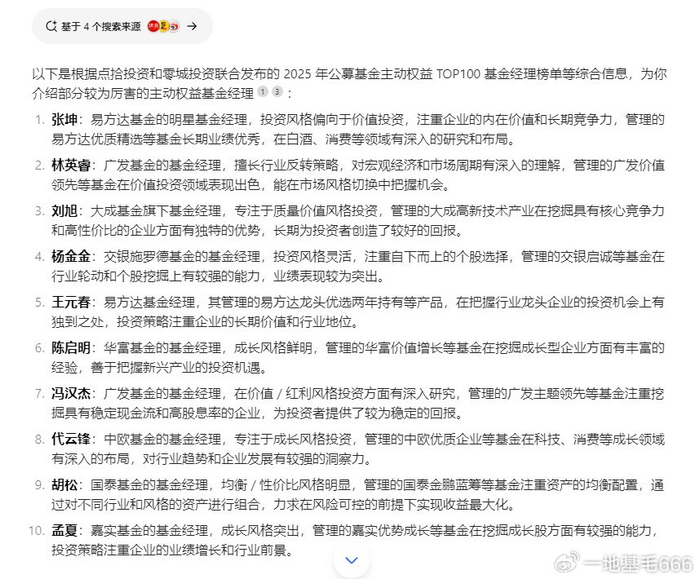 根据提示,豆包主要是根据点拾投资和零城投资联合发布的 2025 年公募基金主动权益 TOP100 基金经理榜单等信息。