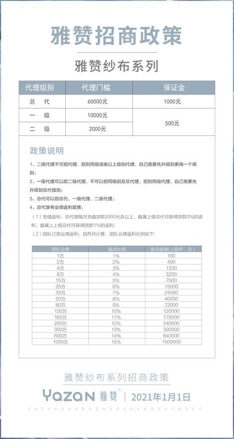 以雅赞纱布系列最新招商政策为例,该系列产品的代理分为三级,即总代、一级和二级,对应拿货门槛分别为60000元、10000元和2000元,其中总代另须缴纳1000元保证金,一级、二级代理另须缴纳500元保证金。与此同时,政策说明规定:除总代可以招总代、一级代理和二级代理外,一级代理、二级代理均不可招同级别及更高级别代理,即一级代理仅可招二级代理,而二级代理不可招代理;若一级、二级代理招到同级别代理,则自己需先升一级。