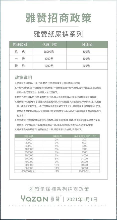 同理,雅赞纸尿裤系列代理亦为三级,级别与纱布系列略有区别,分别为总代、一级和特约,对应拿货门槛分别为38800元、4700元和1300元,其中总代另须缴纳800元保证金,一级代理另须缴纳500元保证金、特约代理另须缴纳200元保证金。但纸尿裤系列较纱布系列相比政策较为宽松,规定一级代理可以招同级别代理,即一级代理招一级代理时,差价利润由直接上级总代和一级代理五五分,业绩计入总代理名下。
