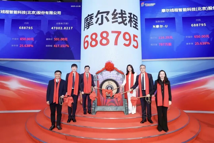登顶今年科创板之最!12月5日,摩尔线程成功登陆科创板,在国产 GPU“ 四小龙 ”的赛道上,摩尔线程率先冲线,成为首个成功登陆资本市场的选手。上市首日,公司股价大涨425.46%,收盘价报每股600.5元,总市值达2823亿元。