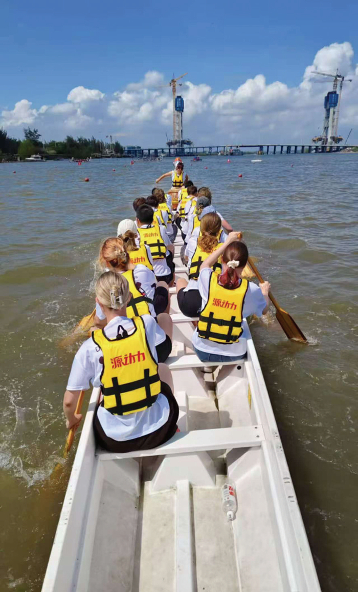 图为来自俄罗斯莫斯科国立语言大学的交换生泰娅(Taya)所在的龙舟队伍伴随旋律的鼓点,向前冲刺。龙舟竞渡是端午节众多民俗中最有节庆气氛的场面。大数据分析显示,最火爆的龙舟观赛地是广州、佛山、杭州、岳阳、成都等城市。观赛人群中外地游客占比达18%,境外游客规模较平日增长64%。龙舟运动正加速“划”向世界,有不少外国友人也参与到龙舟赛当中。5月31日,来自俄罗斯莫斯科国立语言大学的交换生泰娅(Taya)就以新加坡龙舟队队员的身份参加了2025年广西(钦州)—东盟海上龙舟公开赛。该赛事以“龙腾滨海运河城 向海图强立潮头”为主题,设置了200米和500米直道竞速两个项目。来自国内及东盟地区的16支龙舟队伍同台竞技,上演精彩对决。划龙舟这项始于中国的古老运动已然成为不同国家队员之间传递团结精神的载体。